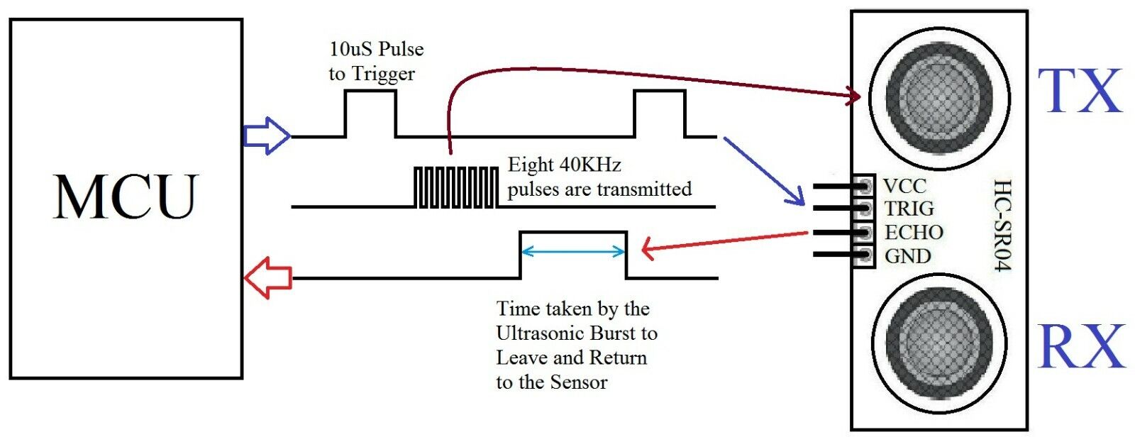 If there is an acoustic signal returned, The ECHO (R) IO port will have a high-level signal. The duration of the high-level signal is the time from transmit to receive using the ultrasonic transducers.